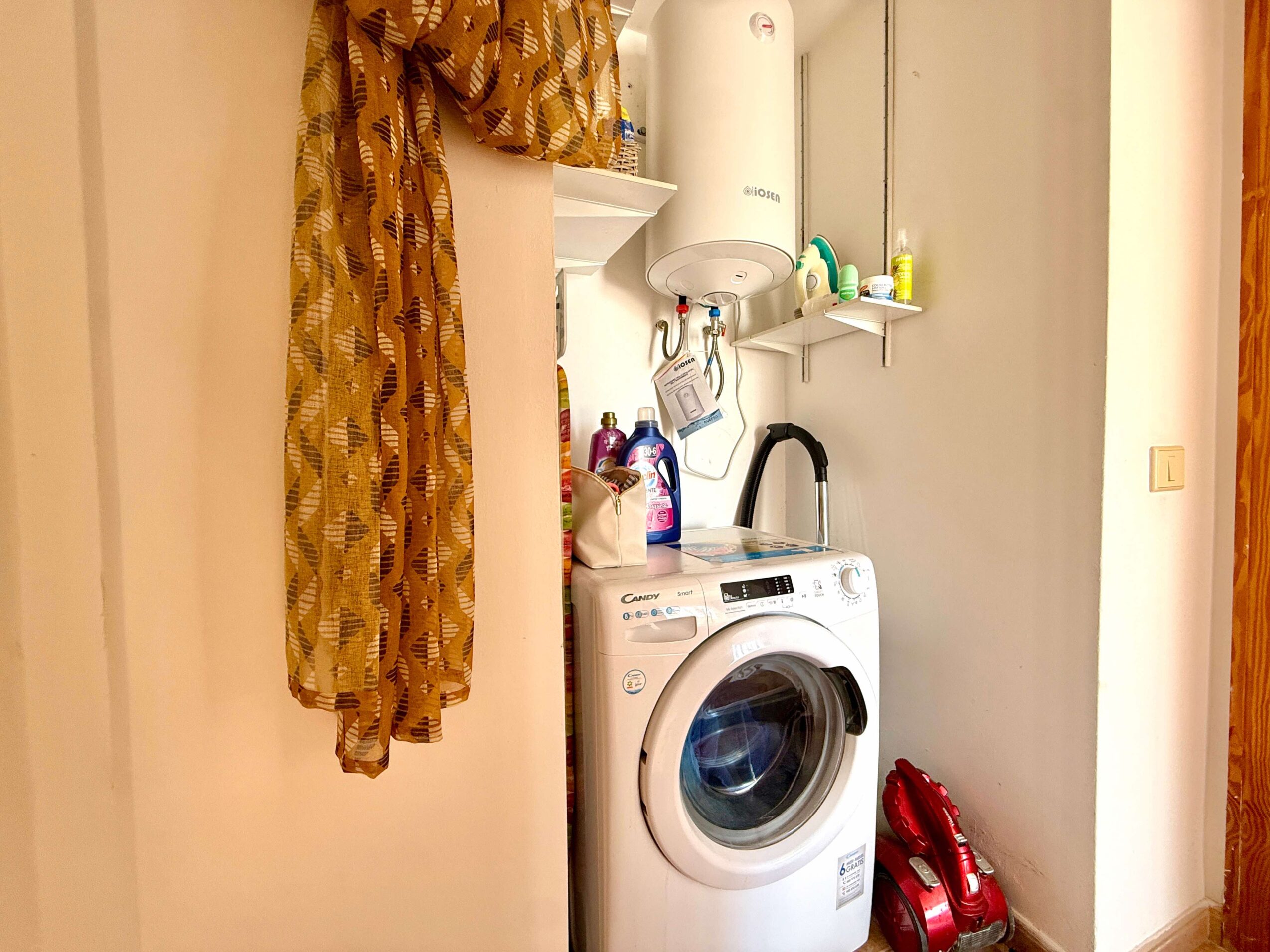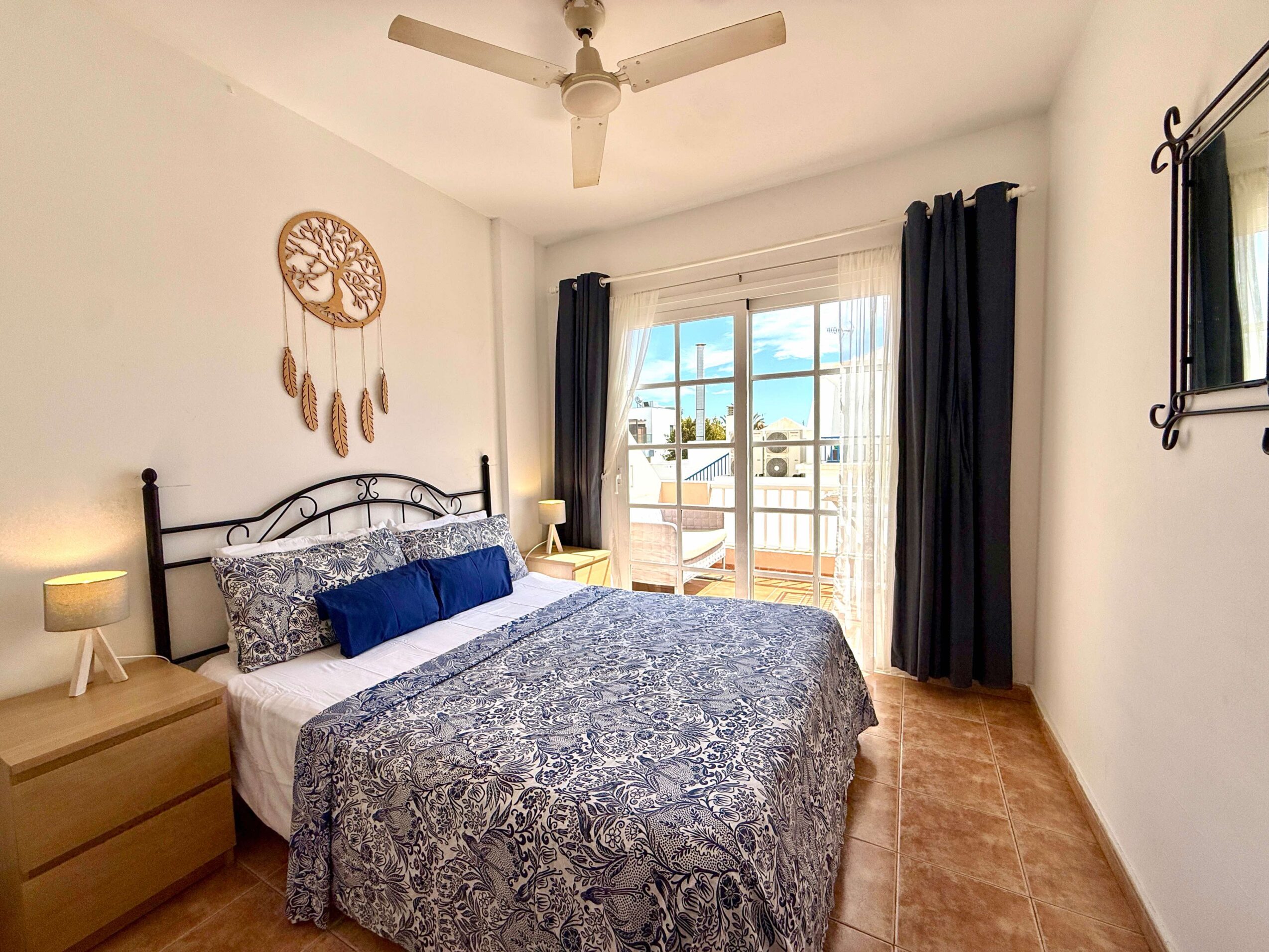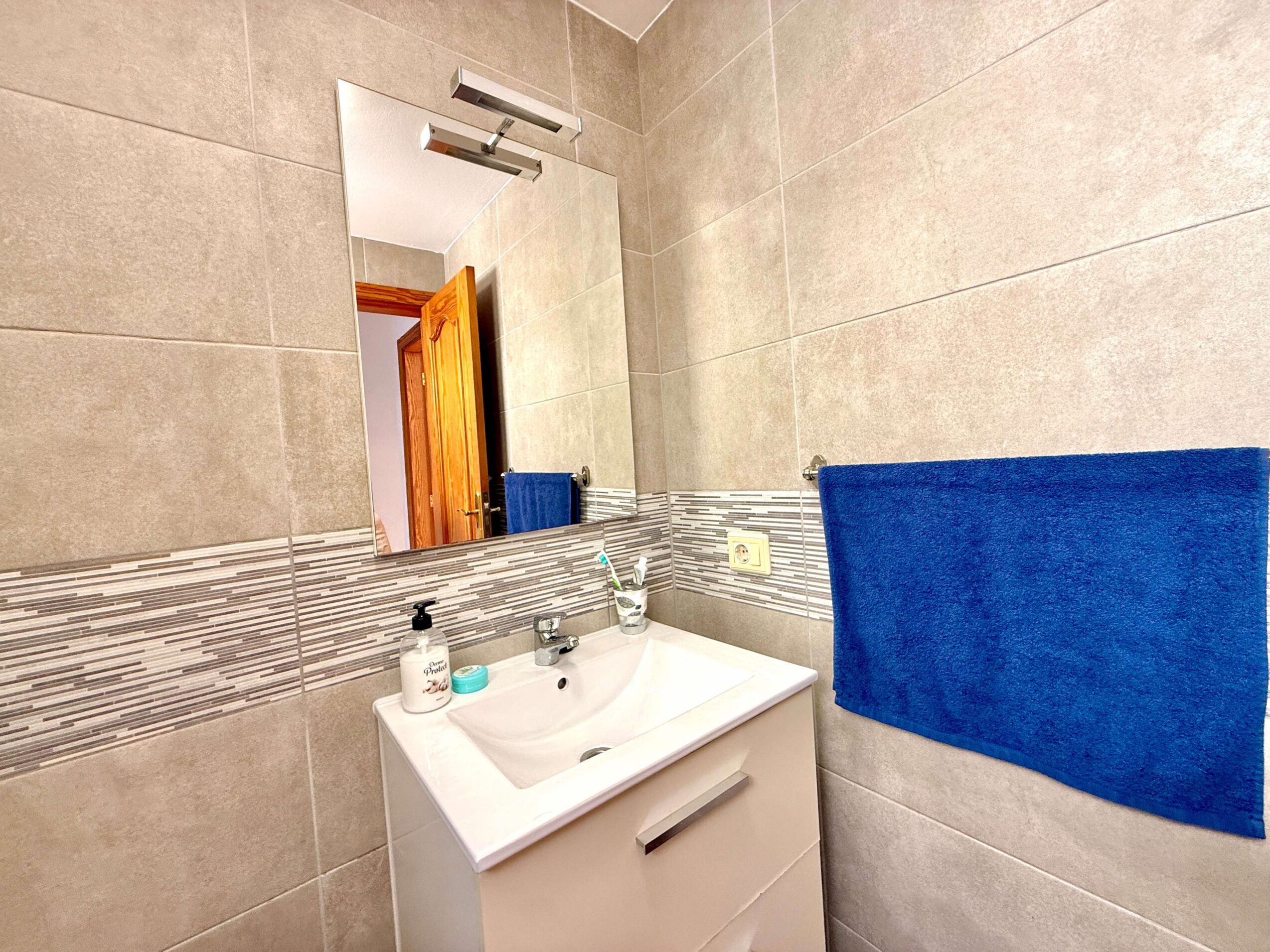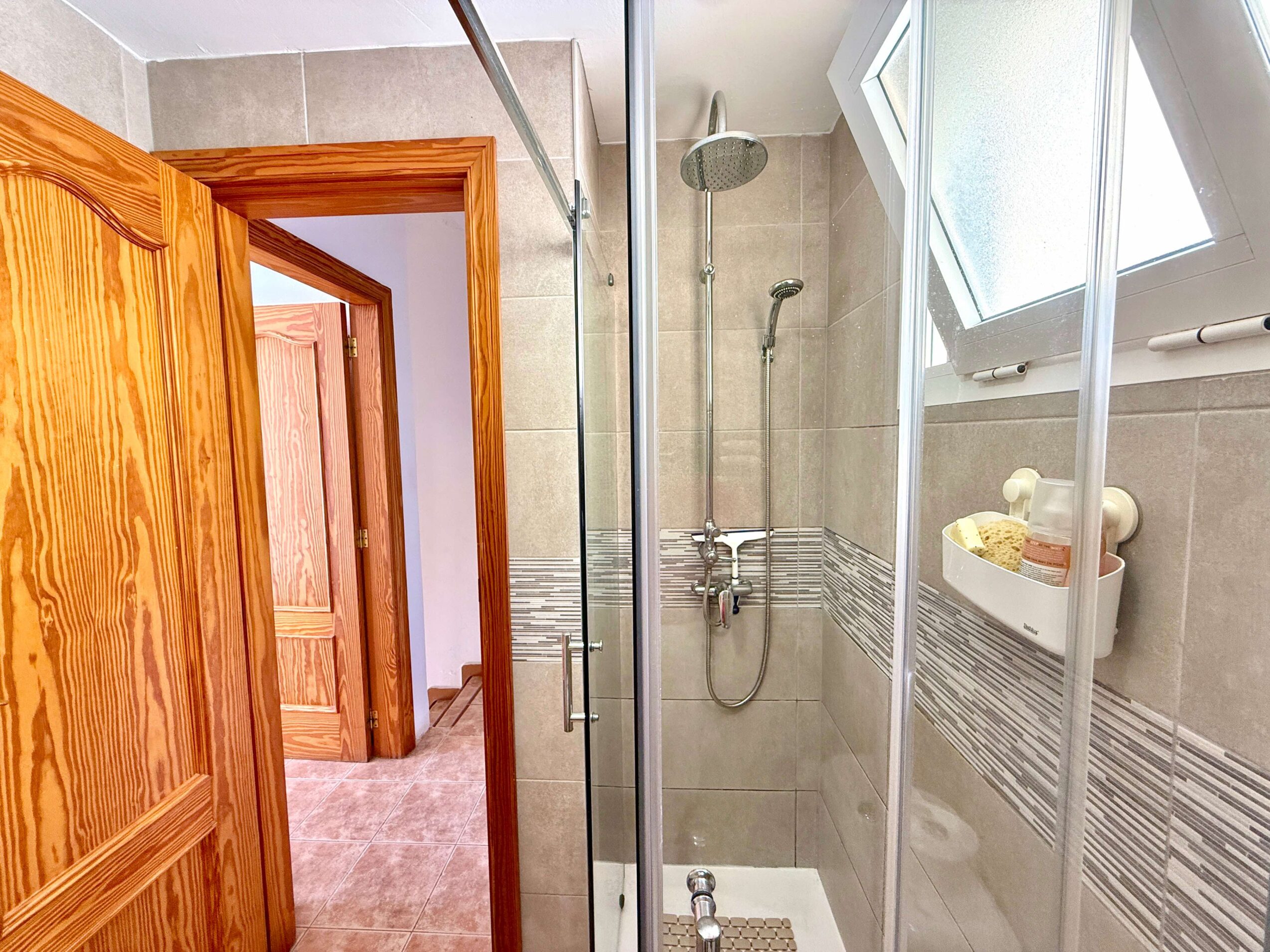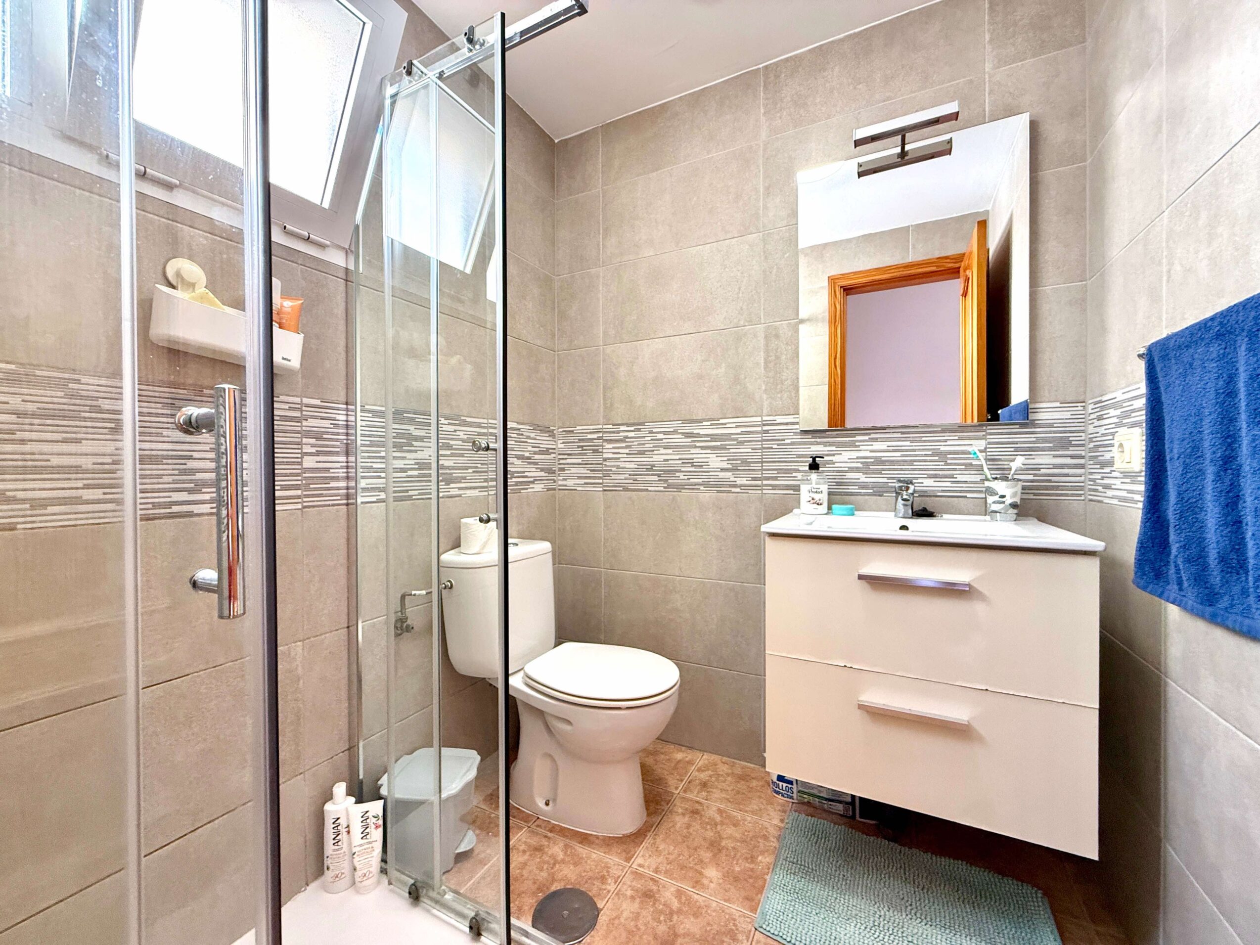En la planta superior se sitúa un cómodo dormitorio con armario empotrado, que ofrece buena capacidad de almacenamiento, además de un baño completo. Desde esta planta se accede a una amplia terraza privada, perfecta para relajarse, tomar el sol o disfrutar de agradables momentos al aire libre.